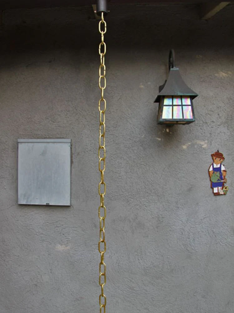 The Large Brass Link Rain Chain is very popular as an architectural element. These solid brass chain links are perfectly understated, simplistic, and elegant, in keeping with original Japanese intent. Made of unfinished, pure brass. Sold by the linear foot. Each rain chain comes with a matching v-hook. The v-hook sits inside the gutter opening to hold the rain chain in place.