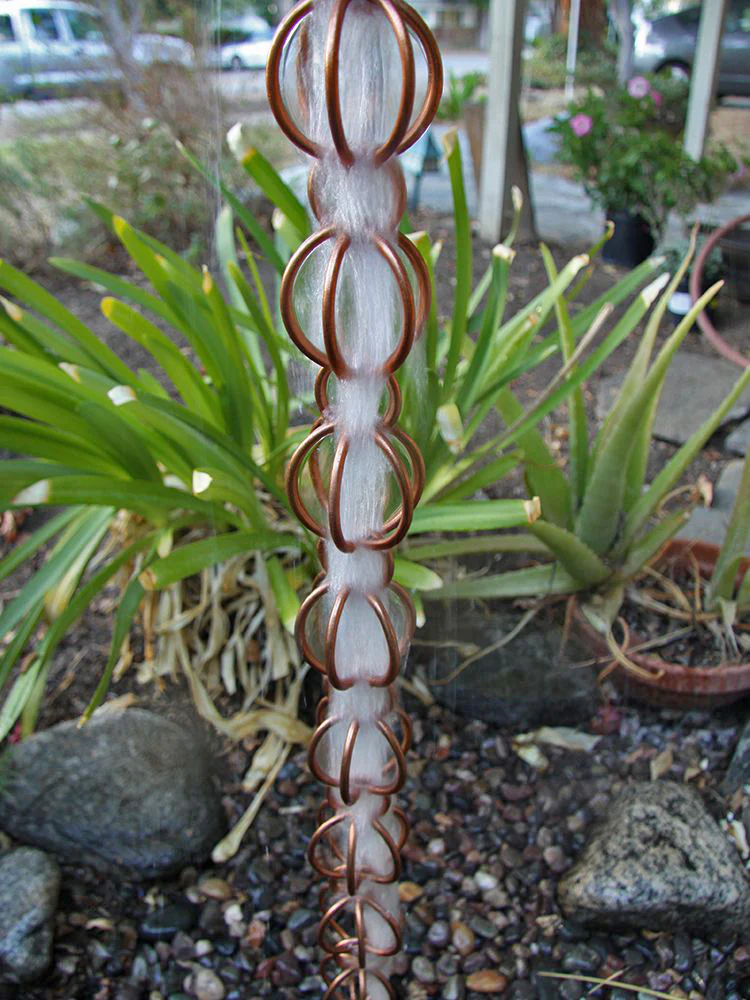 The Triple Loops Rain Chain in pure copper is breathtaking! Three 2.5" intersecting loops connected by smaller single loops make up this beautiful chain. The unfinished copper will patina beautifully over time. This chain is sold by the linear foot.Â