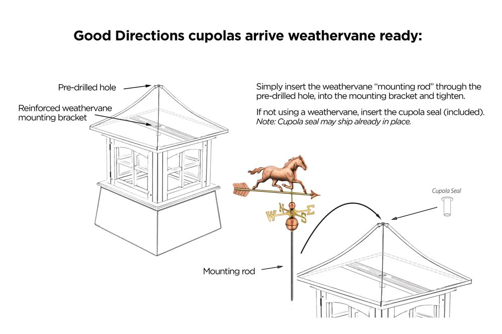 The cupolas arrive in 3 sections for easy installation, includes assembly hardware, predrilled holes, easy-to-follow detailed installation instructions, and are weathervane ready with a built-in internal mounting bracket. YouTube videos are also available to walk you through the installation step by step. Good Directions vinyl cupolas have an industry exclusive Lifetime Warranty. For a distinctive finishing touch to your home, add a Good Directions weathervane or finial.